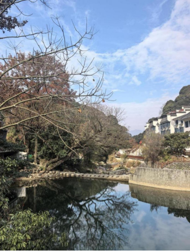 这里是叶村入口,临河傍山,大树阴翳,入口兼祠堂两项功能,原以为只能步行进去,谁知小车也能开过去,只是要小心翼翼,不能会车,只能单行;进村下坡,三面环山,中间一水,水流潺潺,不绝于耳,一片徽派建筑,掩映在大树之间,房子高低错落,从水边向三面山上辐射,白墙黛瓦,像是种在山上;家家有溪流盈缸,户户有茶园绕舍,静心独坐,茶花的幽香似婴孩拂面,一个喷嚏下去,目快神奕;一不留神,有松鼠在 枝头掠过;再小的院子,也有菜地,尽管已到冬季,菜依旧郁郁葱葱,大概是这里小气候和和吧;不远处,不时有山鸡喊上一嗓子,村子里有狗,不叫,一个劲的向你示好,只有风声霖霖,交替辉映小溪或绕舍,或徘徊,或起伏,最后都融进那条秋浦河里;每隔一段,河里都有小坝把水一迎,欢快的水便沉静起来,像个懂事的孩子,清澈可心。